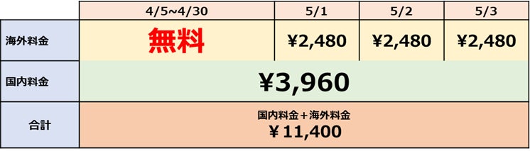 ※4月5日~4月30日は海外料金無料キャンペーン適用。