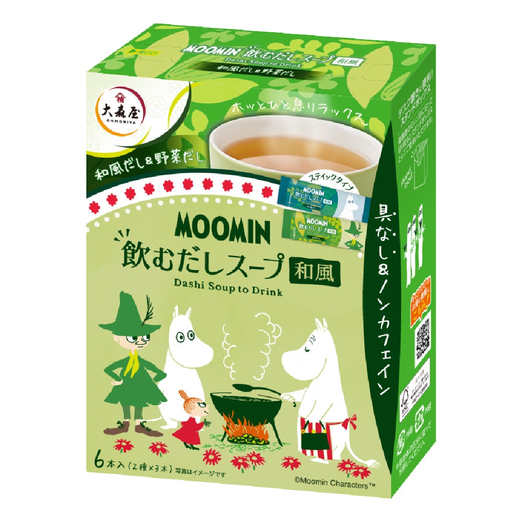 ※具なしでサラッと飲めるだしスープです。商品は和風(和風だし・野菜だし)と洋風(オニオン・ビーフコンソメ)の2種類。仕事の合間にホッとリラックス!ムーミンコラボの可愛らしいパッケージも魅力です。