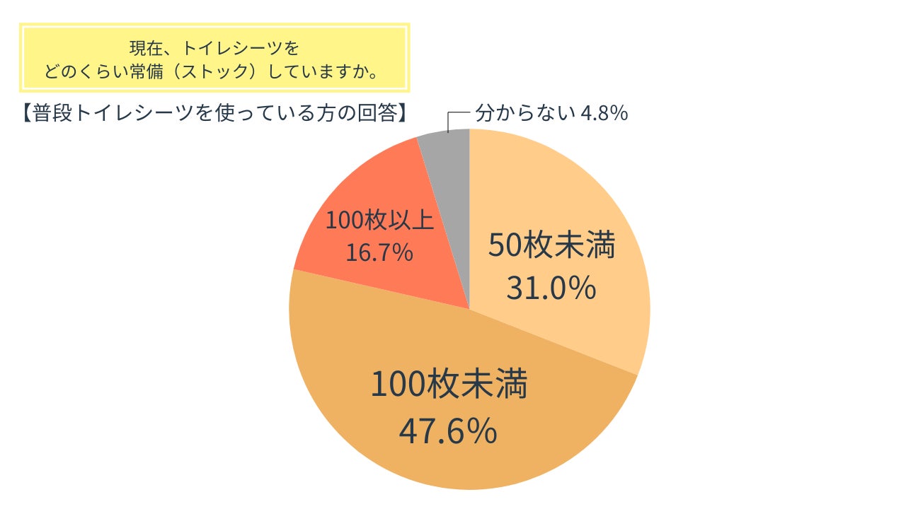 Q1で「トイレシーツのみ」または「トイレ砂・シーツどちらも使っている」と回答した84名にトイレシーツのストック枚数を尋ねたところ、「50枚~100枚未満」が47.6%で最も多い結果となりました。