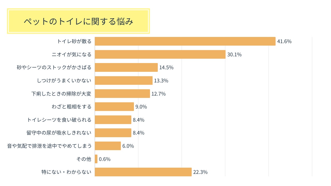 また、「砂やシーツのストックがかさばる(14.5%)」「下痢をした時の掃除が大変(12.7%)」といった回答も挙げられ、飼い主様の多くが日々のトイレ管理に何らかの悩みを抱えていることが分かりました。