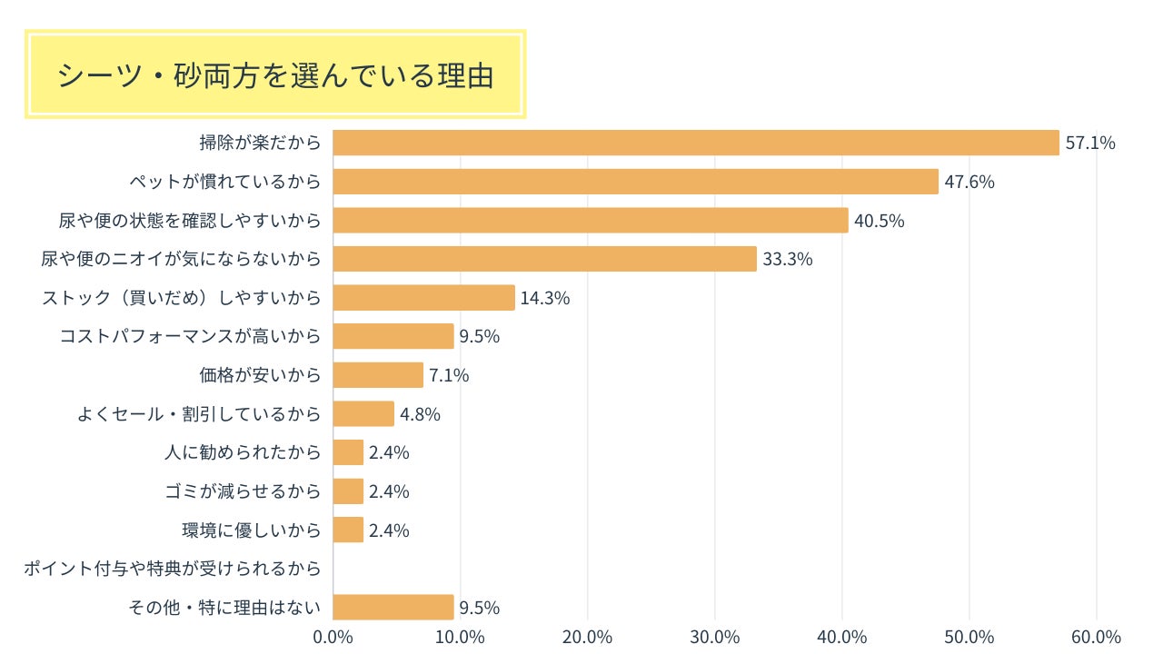 トイレシーツとトイレ砂を両方使用している飼い主様の回答傾向も、おおよそ他のグループと同じ結果になりました。いずれのグループでも「掃除が楽だから」が1位、次いで「ペットが慣れているから」2位になっており、どのトイレ環境でもペットの習慣や使いやすさが大きなポイントとなっていると推察されます。