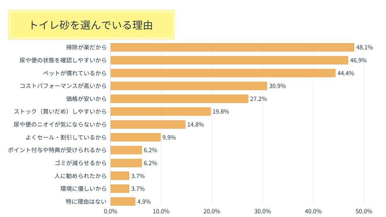トイレ砂を使用している飼い主様が挙げた理由としては、「掃除が楽だから(48.1%)」が第1位、次いで「尿や便の状態を確認しやすいから(46.9%)」「ペットが慣れているから(44.4%)」が僅差で続きました。
