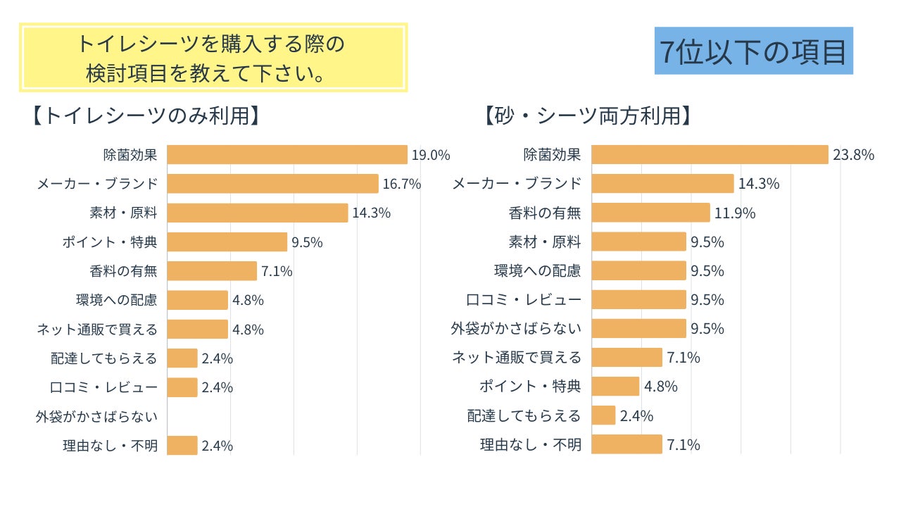 トイレシーツのみ、砂・シーツ両方どちらのグループでも「価格」が第1位となり、コストを意識して購入している飼い主様が多いことがうかがえます。特に砂・シーツ両方派の方は71.4%と大多数の飼い主様がコスパを気にしていることが分かります。