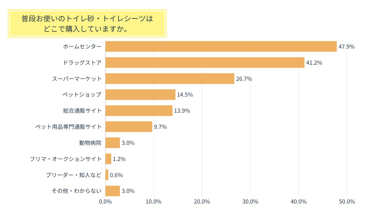 購入場所として最も多かったのは「ホームセンター」で47.9%、続いて僅差で「ドラッグストア(41.2%)」が第2位と、近隣の店舗で直接購入する飼い主様が多い傾向がうかがえます。トイレ砂・トイレシーツといった商品を購入する際は、手軽さや店舗の近さが選択基準として大きく影響するといえるでしょう。