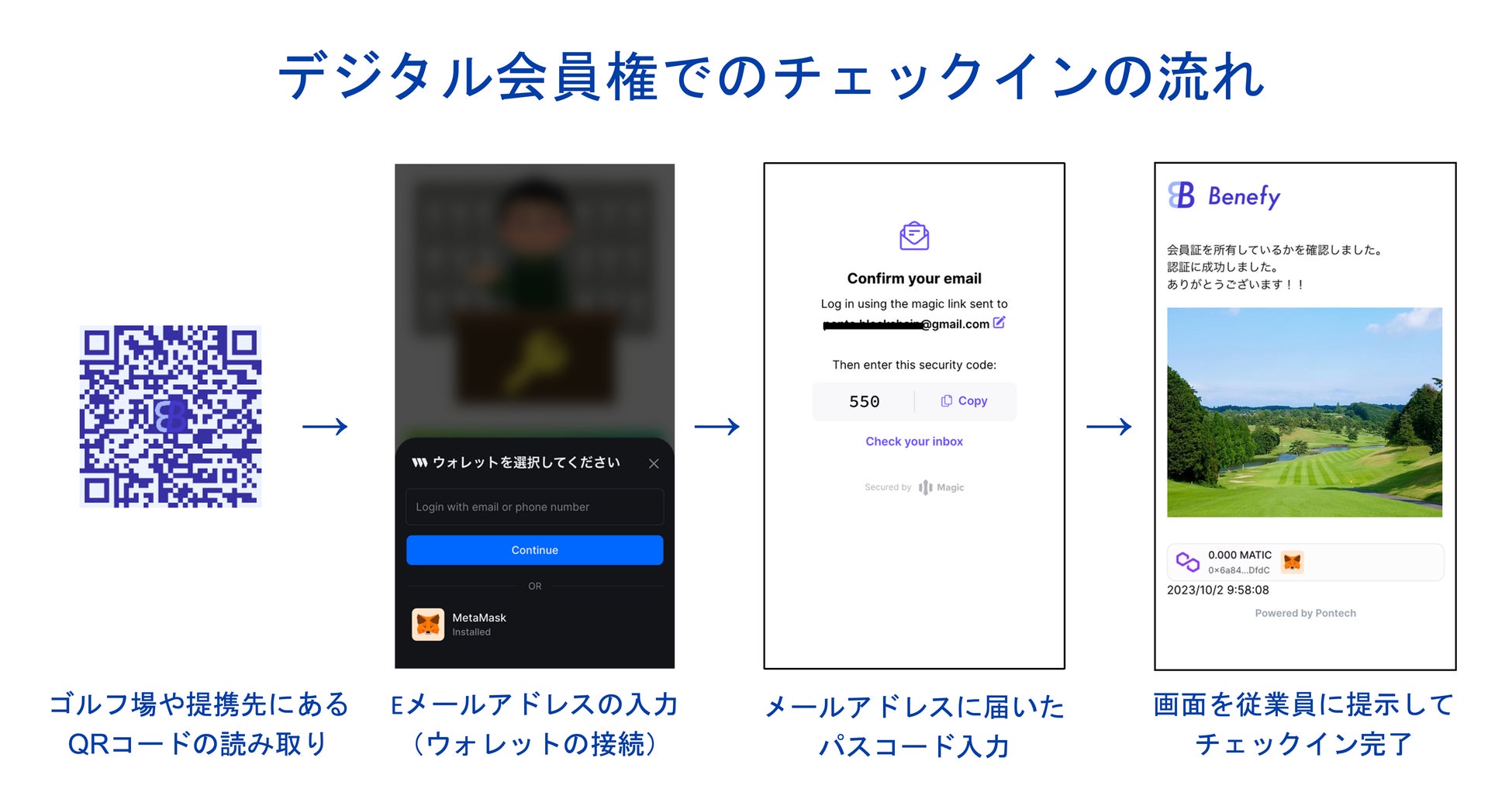 デジタル会員権の導入により、スマートフォンでQRコードを読み込み、メールアドレスの認証をするだけでチェックインをすることが可能なため、会員証をゴルフ場に行く際に常に携帯する必要はありません。また、会員権の譲渡手続きも簡単に行うことができ、ゴルファーの手続きの簡略化とゴルフ場の業務負荷の軽減に繋がります。