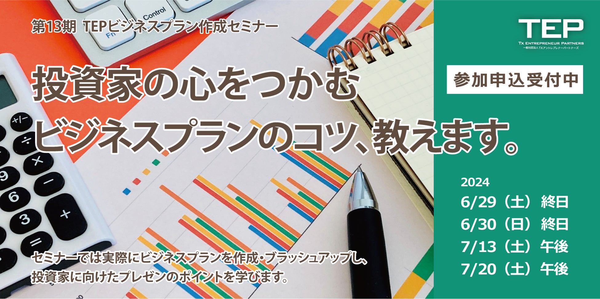 技術系スタートアップの支援組織『TEP』(正式名称:一般社団法人TX アントレプレナーパートナーズ、代表理事:國土 晋吾)は、2024年6月に開催予定の「TEPビジネスプラン作成セミナー(以下、TEP BPセミナー)」の参加企業を、4月15日(月)より募集開始しております。TEP BPセミナーは、TEPが本拠点とする柏の葉キャンパスにて2012年より毎年開催しており、今回が第13期の開催となります。