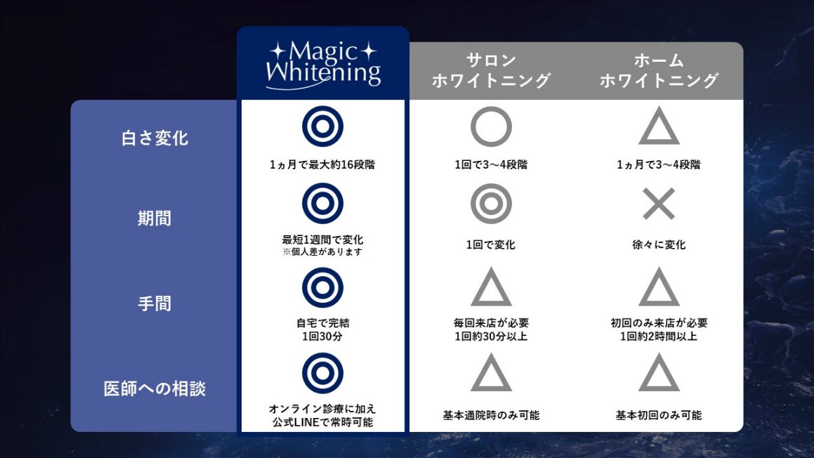 歯科医院向け薬剤を家庭用に調整。サロン型や従来型ホームホワイトニングに比べ、手軽さ・効果スピード・安全性を兼ね備えています。