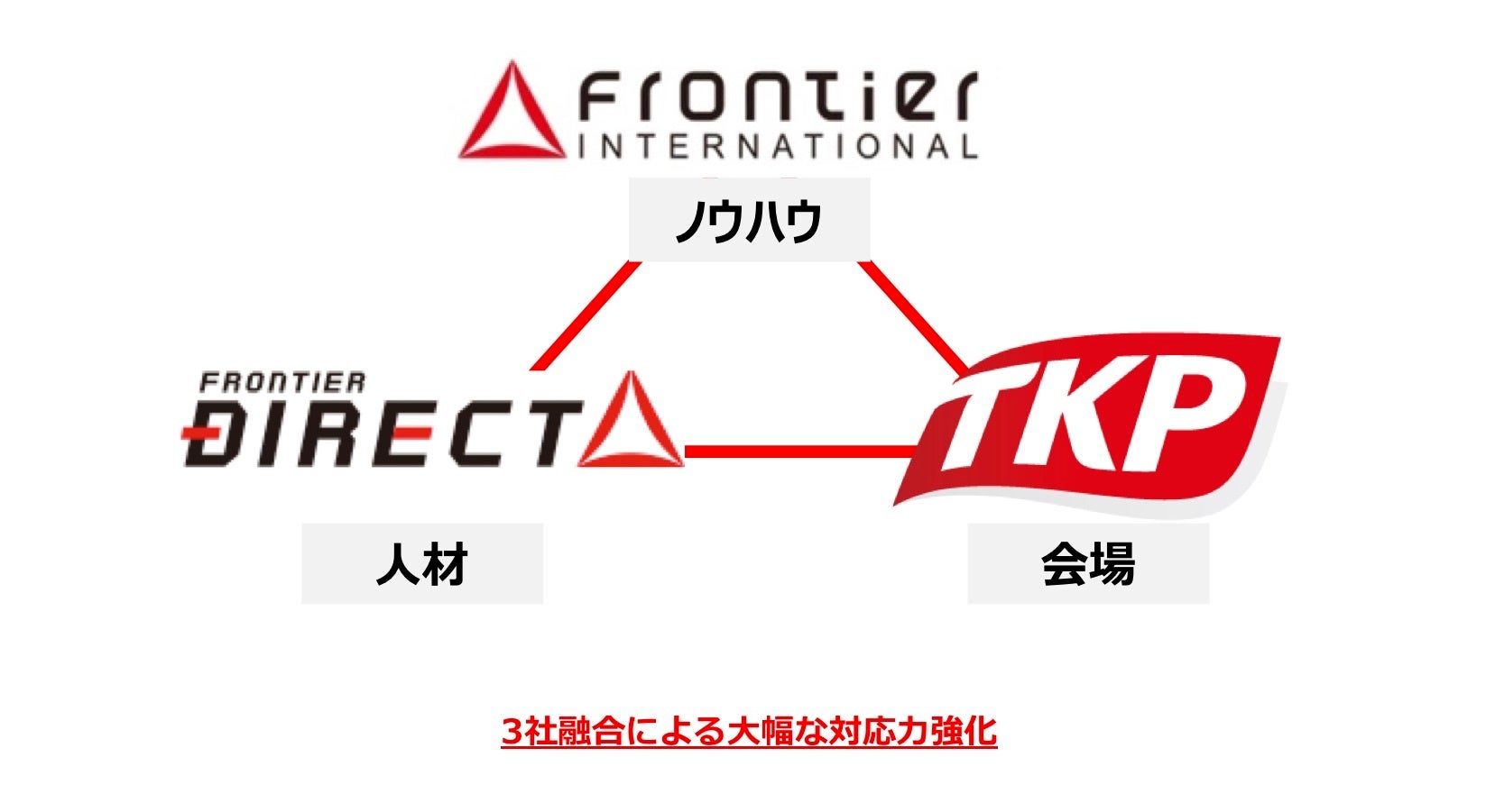 株式会社フロンティアインターナショナルグループ(本社:東京都渋⾕区、代表取締役社⻑:河村康宏、グループ:株式会社フロンティアダイレクト)は、全国で241施設/約2,000室の会議室・宴会場を運営している株式会社ティーケーピー(本社:東京都新宿区、代表取締役社長:河野貴輝)とBPO事業のサービスを強化し、迅速且つ、最適な立地の選定、良心的な価格の実現を目指すことで、お客さま満足度の向上を図ります。