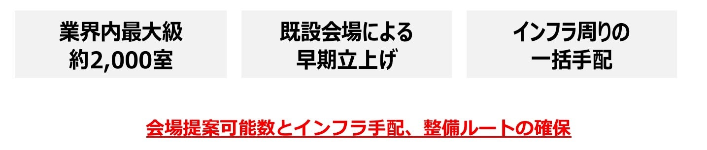 業界内最大級の全国約2,000室以上の施設提供可能数を主要都市収容年の駅近など好立地に多く保有。既設の会場を利用することで立上げまでの期間短縮が可能となることに加え、アクセス面も考慮された会場となる。