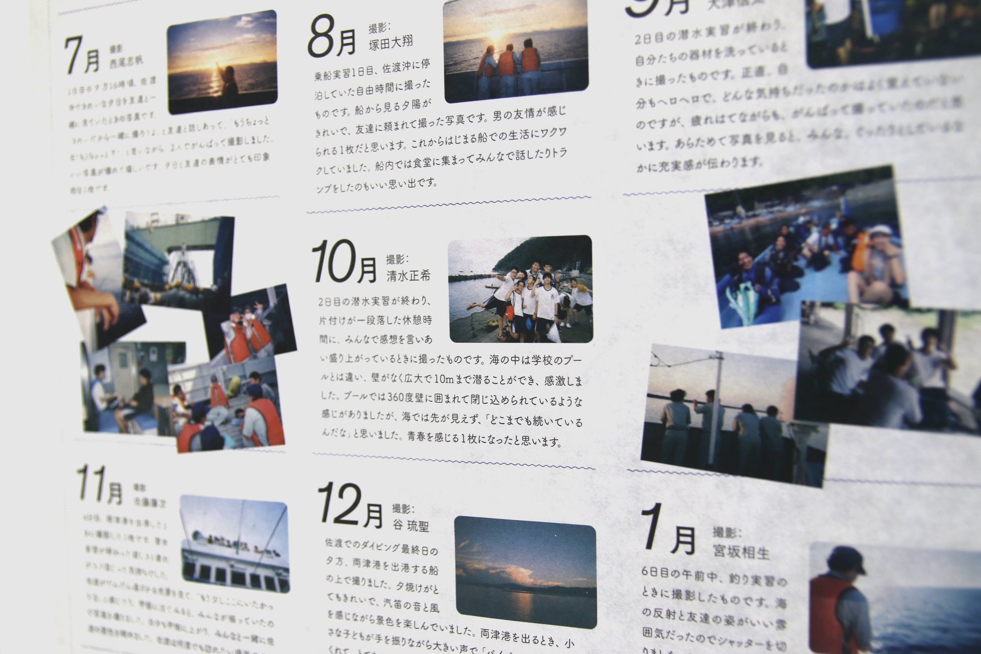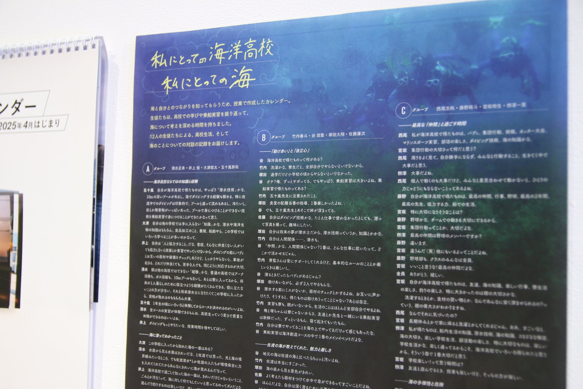 カレンダーには特別な付録が同封されています。表面には生徒たちが撮影した写真の思い出が綴られ、裏面には高校での学びや「海」についての対話の記録が掲載されています。この付録を通じて、海洋高校の新たな一面を感じていただけると嬉しいです。