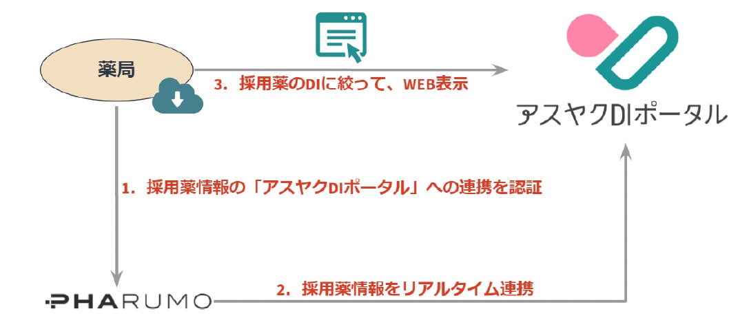 一方弊社では「ファルモクラウド」を元にした薬局支援サービスの中で、既に薬局の採用薬を定期的に更新する機能を提供しており、「アスヤクDIポータル」上で「採用薬DI絞り込み機能」を提供するにあたりシステムとしての親和性が高く、2社のサービスを連携することで薬局・製薬企業間コミュニケーションの最適化のを実現するために採用されました。