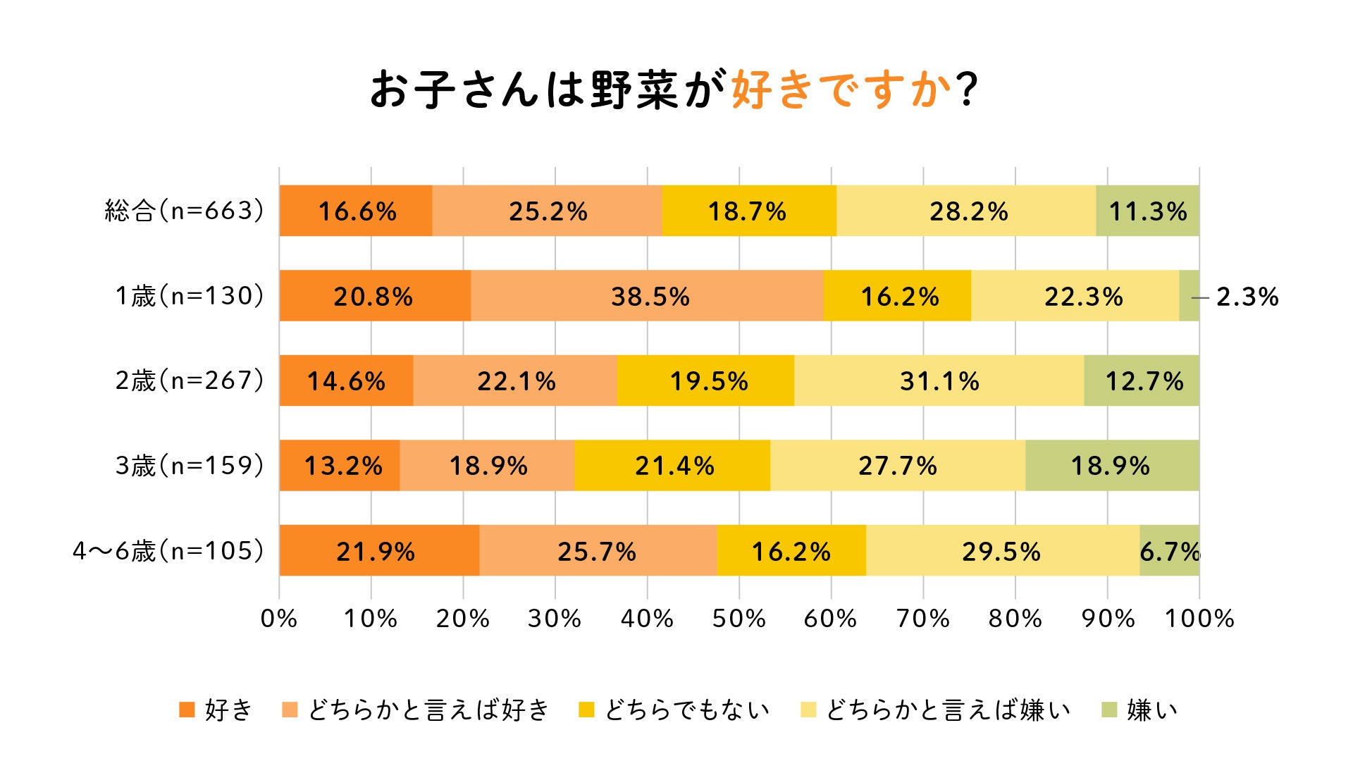 「お子さんは野菜が好きか」を尋ねたこところ、1歳児は「好き」「どちらかと言えば好き」が59.3%、2歳児は36.7%、3歳児は32.1%、4~6歳児は47.6%となり、1歳児は野菜好きが多いことがわかりました。また、3歳児は18.9%が「嫌い」と回答したことから、3歳児は野菜が苦手であることもわかりました。