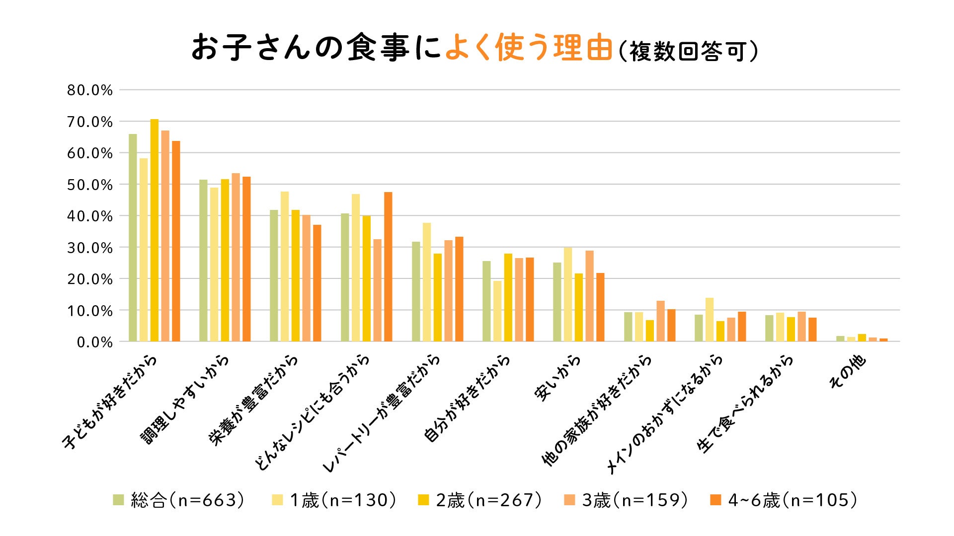 なぜよく使うのか尋ねたところ、「子どもが好きだから」「調理しやすいから」「栄養が豊富だから」「どんなレシピにも合うから」などでした。