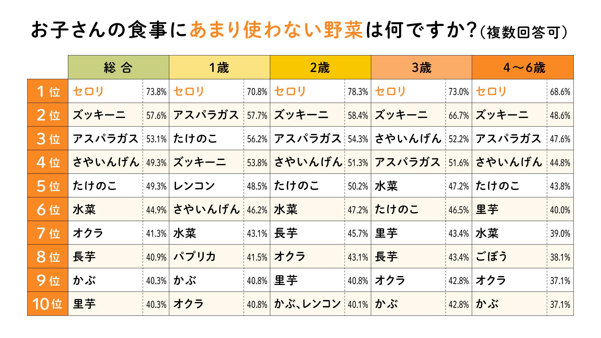 逆に「お子さんの食事にあまり使わない野菜」について尋ねたところ、どの年齢でも最多だったのは「セロリ」でした。「ズッキーニ」「アスパラガス」「さやいんげん」「たけのこ」も上位でした。