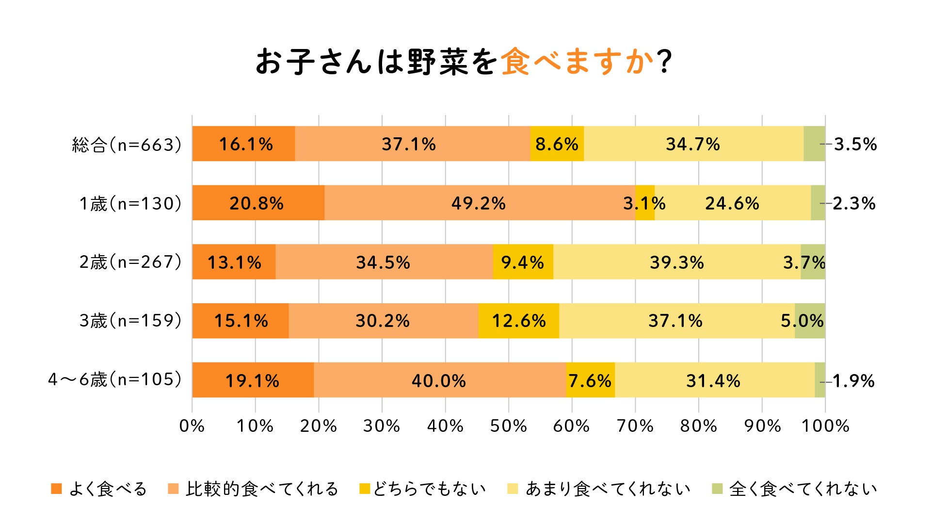 次に、「お子さんは野菜を食べるか」尋ねました。ここでも1歳児は「よく食べる」「比較的食べてくれる」が70.0%(2歳:47.6%、3歳:45.3%、4~6歳:59.1%)と多い結果となりました。