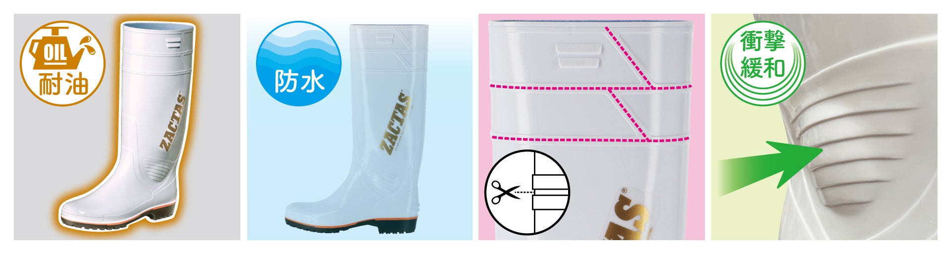 「ザクタス」シリーズは、作業性を高めるしなやかさと柔軟性を保ちつつも、耐久性をサポートする耐油性を合わせ持っています。41.5cmの外寸丈(26.0cmの場合)により高い防水性も発揮するPVC長靴です。
