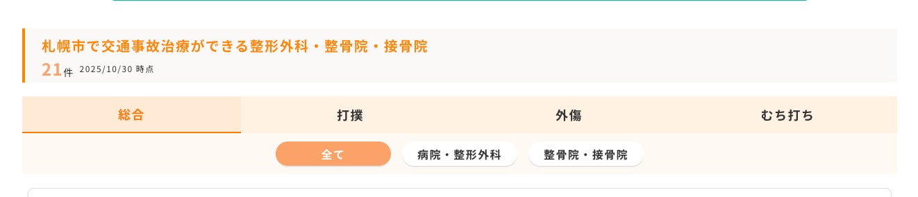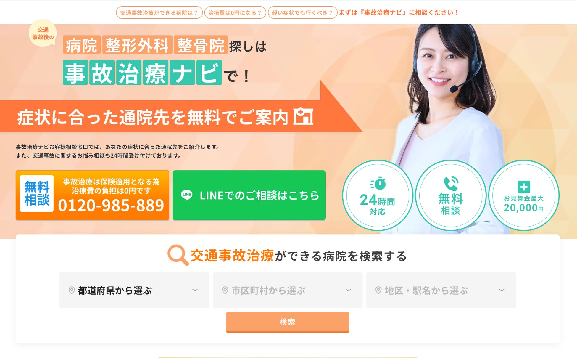 事故治療ナビは、交通事故に遭った方が「適切な治療先を最短で見つけられる」ことを目的とした事故治療専門の検索プラットフォームです。