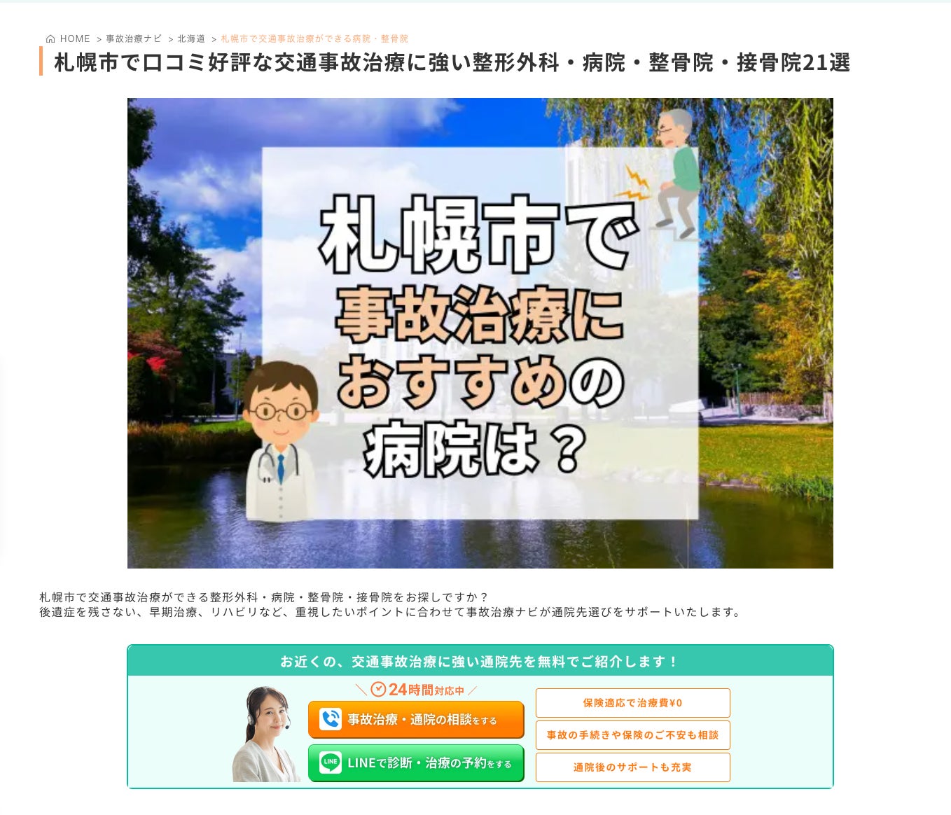 事故直後の不安なタイミングでも、迷わず治療院を選べるよう、導線・UI・構造をすべて再設計。記事内の医院情報・治療解説・比較要素も刷新し、ユーザーが最短で最適な通院先を見つけられる仕様になっています。