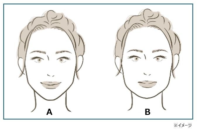 下のイラストのAとB、2つのイラストで、どちらが若々しく見えるか、というアンケート(*)を実施したところ、約94%がAの方が若々しいと答えました。AのフェイスラインがシャープなV字型になっているのに対し、BはU字型に見えるので、顔の下半分が大きい印象があります。ドクターフィル コスメティクス ブランドコンサルタントの平山真奈先生によると、顔の下半分が大きく見えるのは、肌のハリや弾力感が失われ、皮膚が下垂することが原因。このような肌悩みは年齢とともに現れやすく、顔の最下部であるフェイスラインがV字型からU字型へとゆるむことで、若々しい印象が損なわれてしまうのです。