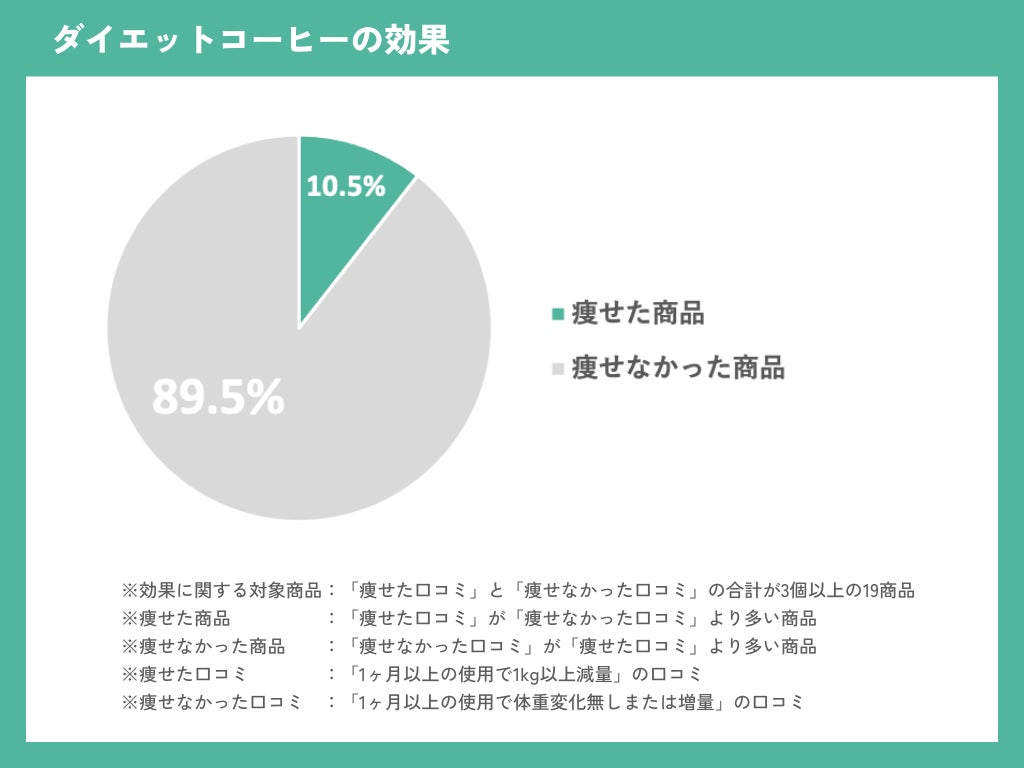 痩せた口コミの方が多いダイエットコーヒーは、全体の10.5%(19個中、2個)