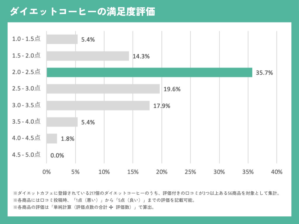 ダイエット効果が期待される56個のコーヒーに寄せられた1738件の口コミを分析したところ、「2.0-2.5点(まぁまぁ悪い)」という評価を受けているダイエットコーヒーが35.7%(20個)と最も多くなっていることが判明しました。