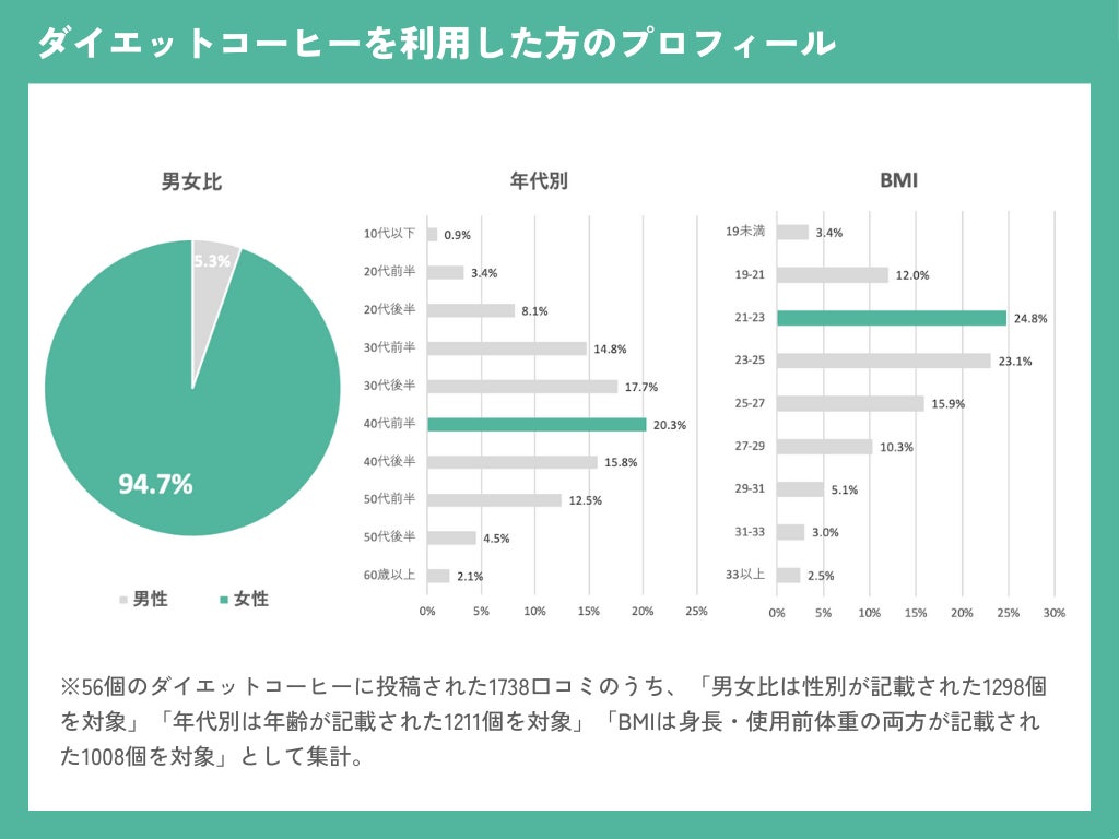 ダイエット効果を期待してコーヒーを利用する方々のプロフィールについて、56個のダイエットコーヒーに寄せられた1738件の口コミを分析しました。その結果、利用者の94.7%が女性であり、年齢層は40代前半が特に多くなっていました。さらに、肥満度指数(BMI)に関しては、健康的な標準体重(22)付近である「21-23」の範囲の方が24.8%と最も多いことが分かりました。