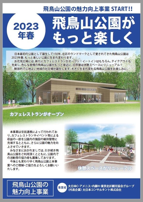 本グループでは、飲食施設(カフェレストラン)や休憩スペースを整備し、地域の社交場として交流を促進するとともに魅力ある飛鳥山公園を実現します。