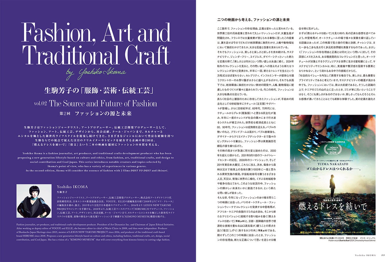 ファッションジャーナリスト、アートプロデューサー、伝統工芸開発プロデューサーとして多岐にわたる視点から新世代のライフスタイルを提案する生駒芳子による連載第2回は、『燃えるダンスを紡いで』、『倭文』という二本の映画を題材にファッションの本質を考える。