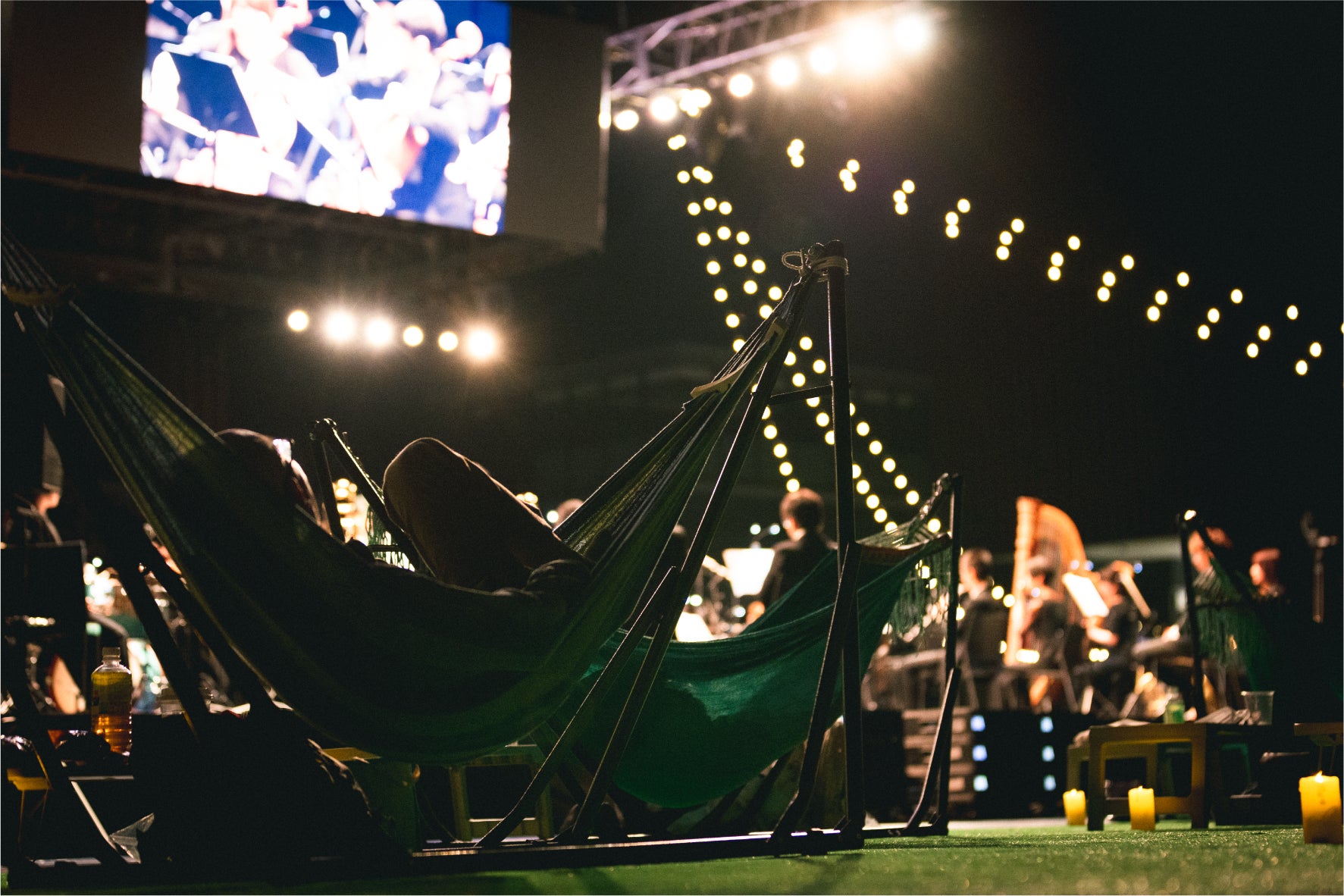 キャンプ場を思わせるようなライトや芝生が敷かれた会場一面に、リクライニングチェアやハンモック、ビーズクッションといったリラックスできる座席がずらりと広がり、通常のクラシックコンサートとは全く異なる幻想的な空間に。