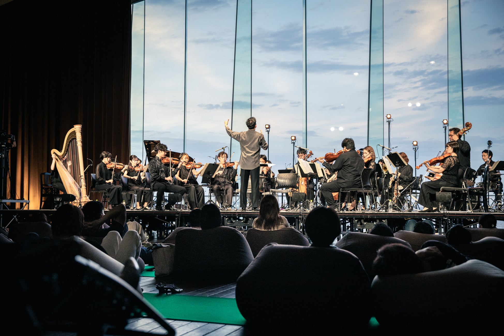 来場した約6,000名の観客は思い思いのくつろいだ体勢で、指揮・永峰大輔、新日本フィルハーモニー交響楽団2nd首席ヴァイオリニスト・ビルマン聡平を中心に集結した、約30名のトップオーケストラ奏者による生演奏を堪能しました。