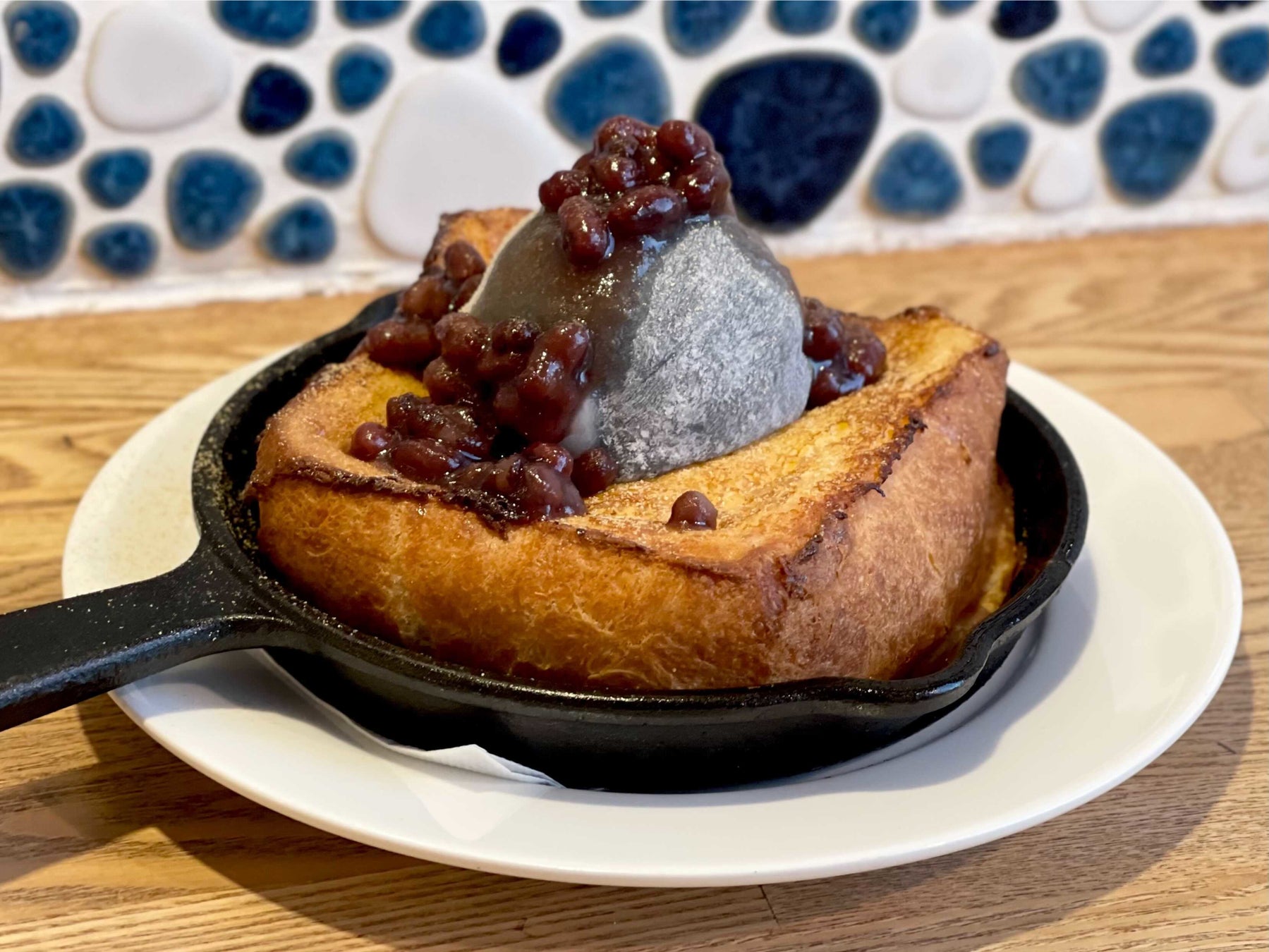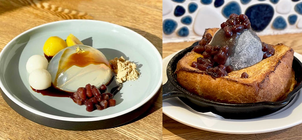 大人気「ムーの鉄板フレンチトースト」に、求肥で包んだ濃厚黒ゴマアイスを贅沢にのせ、あずきときな粉をトッピングしました。お正月らしい【和】な限定フレンチトーストです。