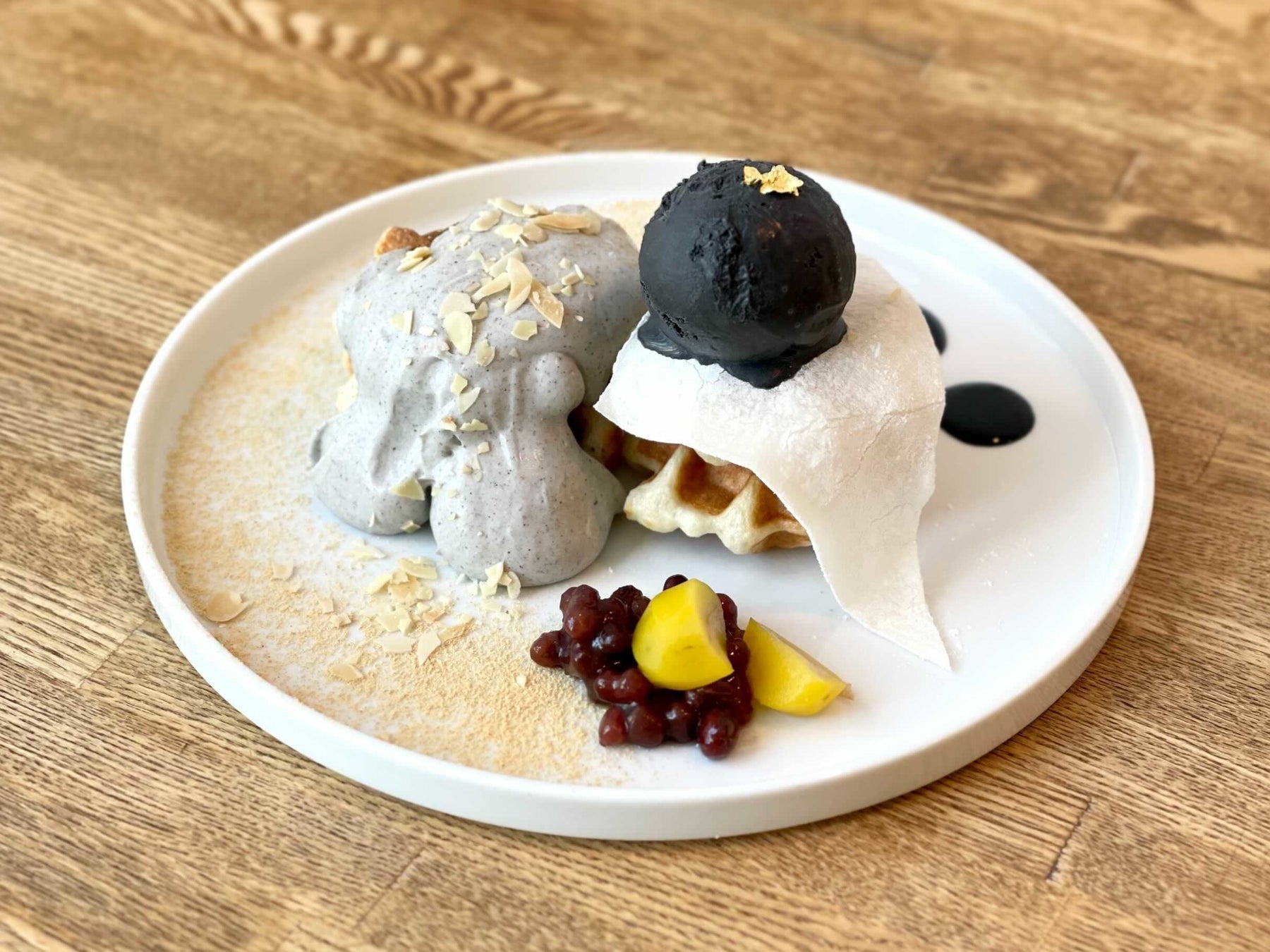 大人気食パン「ムー」の生地ををワッフル型で焼いた「ムッフル」の、1月限定メニュー。濃厚黒ごまアイスと自家製の黒ごまクリームをのせ、求肥やきな粉、小豆、栗の甘露煮など、和の素材をトッピングしました。ムッフルの塩味と黒ごまの香ばしく上品な甘さが相性抜群です。