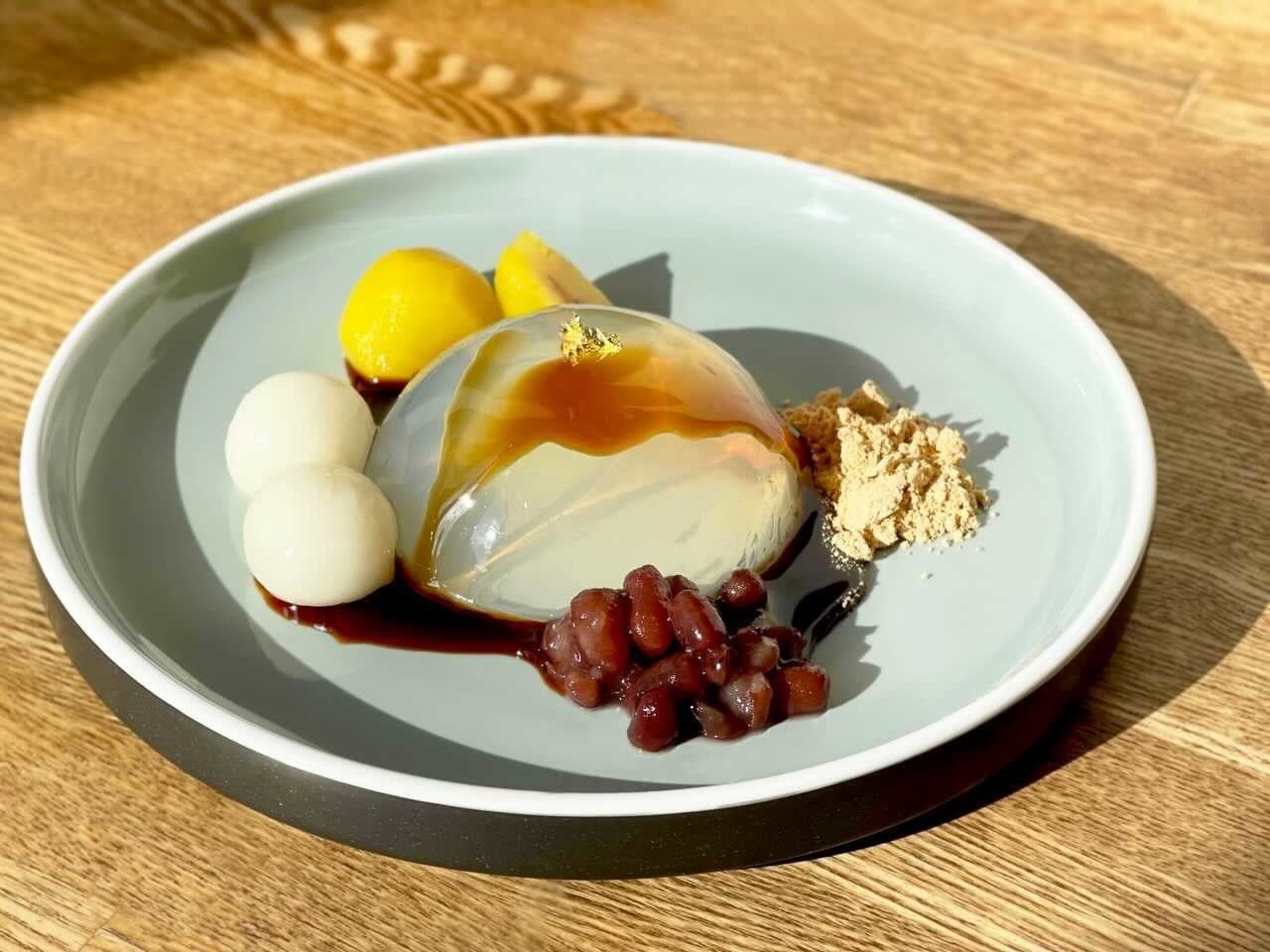 艶々で、口溶けのいいぷるぷる食感の水餅に、白玉、あずき、栗、きな粉、黒蜜をトッピングしました。お正月の期間限定メニューです。