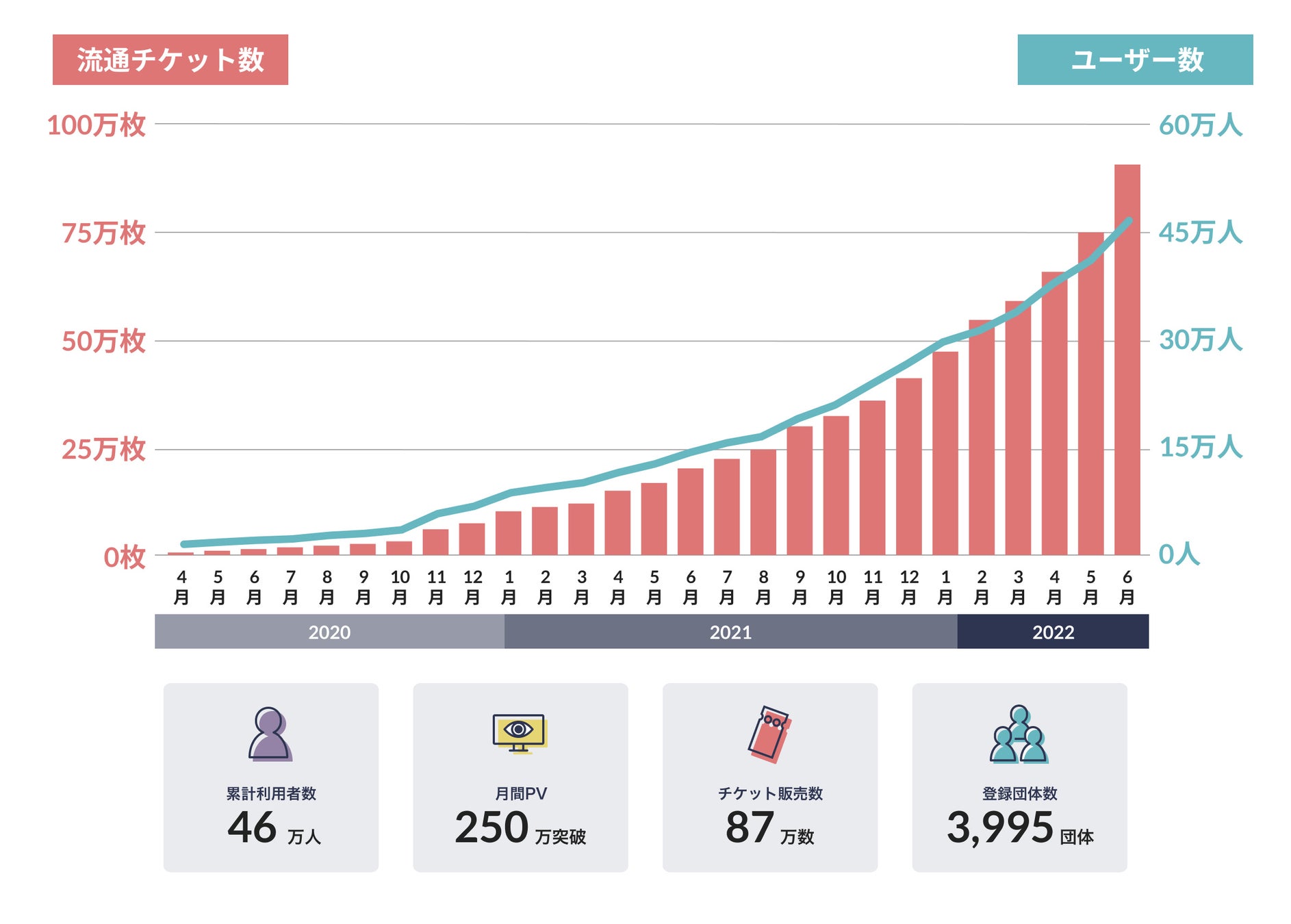 おかげさまで2022年6月30日時点で、チケット流通総額は5.7億円を突破。前年比約420%の成長となりました。累計利用者数は46万人を突破。約4000の団体さまに会員登録いただき、約87万枚のチケットが販売されています。