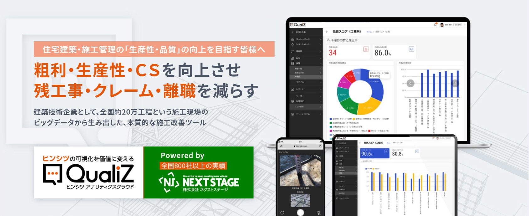 当社は、2006年8⽉の創業以来、⽊造住宅を中⼼とした多くの住宅事業者の施⼯基準の策定から、施⼯品質の評価、分析、改善に向けてのコンサルティングを提供致して参りました。そして更なる顧客ベネフィットに応えるため、20万⼯程を超えるこれまでの施⼯現場の技術情報をビックデータ化し、2022年2⽉にヒンシツアナリティクスクラウド「QualiZ(クオリツ)」をローンチいたしました。このQualiZは、住宅の製造プロセスにおける「モノ(建物)」の品質管理状況や、施工に関わる「ヒト(技術者)のタスク管理における推進状況を様々な⾓度から定量的に分析し、抽出された重点課題を効率よく、そして効果的に改善しやすくする、住宅事業者の付加価値⽣産性の向上に資するクラウドサービスとなります。