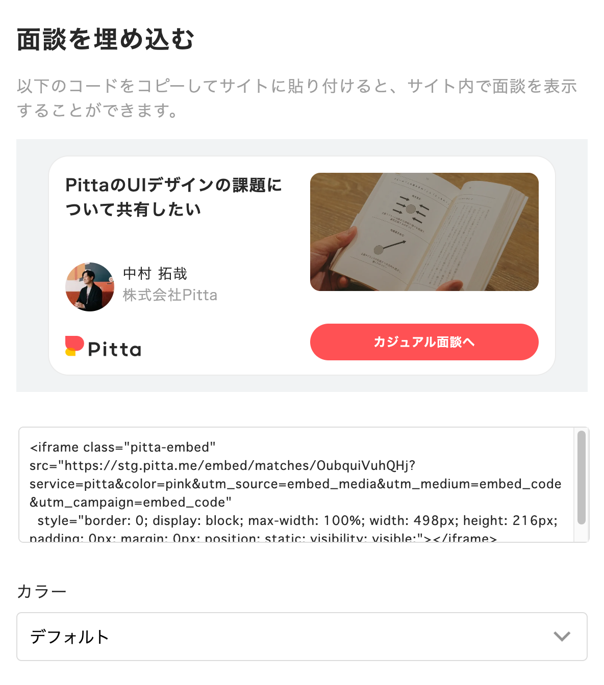 埋め込みされる面談の見た目は、Pittaのブランドカラーであるピンクに加え、ブラック・ホワイトといった3つのカラーから選択が可能です。