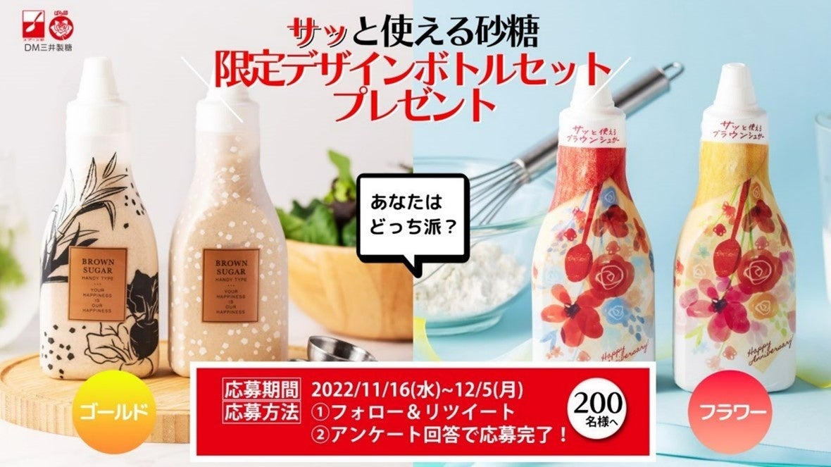 「スプーン印」「ばら印」のお砂糖でおなじみのDM三井製糖株式会社(本社:東京都中央区、代表取締役社長 森本卓)は、新会社発足を記念して「サッと使える砂糖ボトル260g」の限定デザイン(非売品)プレゼントキャンペーンを開催いたします。