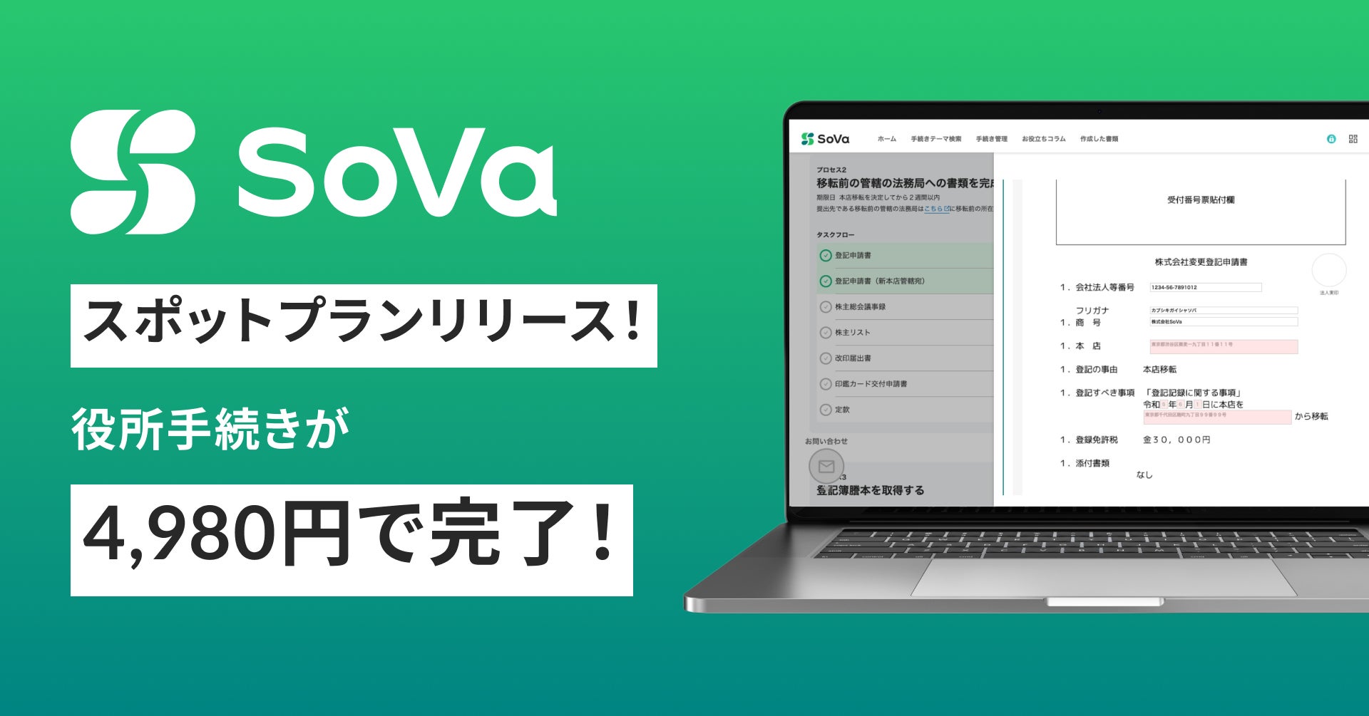 テクノロジーと専門家を掛け合わせた新しい形の会計事務所「SoVa」を運営する株式会社SoVa(本社:東京都中央区、代表取締役:山本健太郎、以下「当社」)は、プロダクト「SoVa」内で行える手続きのうち、必要な手続きだけを都度課金制でご利用いただける「スポットプラン」をリリースいたしましたのでお知らせいたします。