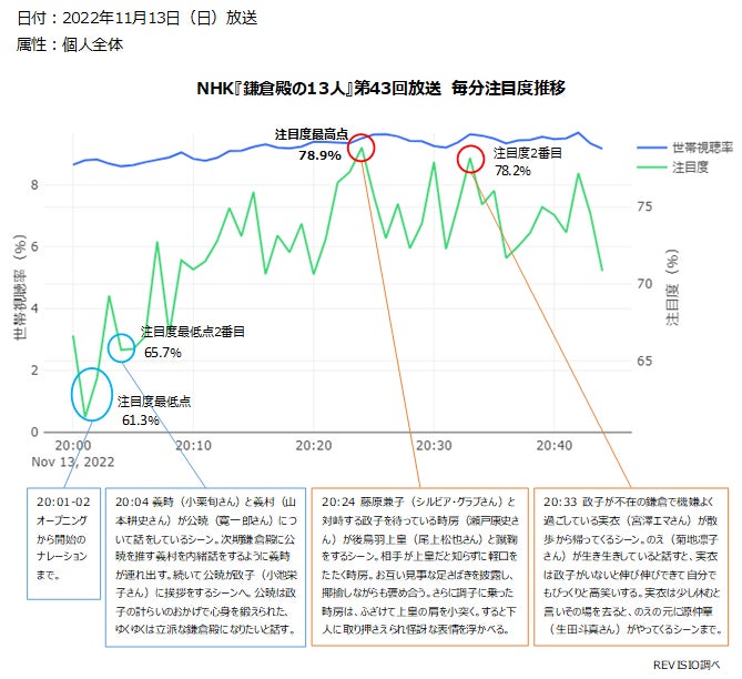 ご家庭に人体認識技術を搭載した機器を設置し、テレビスクリーンの「視られている量」を測るREVISIO株式会社(2022/10/1にTVISION INSIGHTSから社名を変更、所在地 :東京都千代田区、代表取締役社長 郡谷 康士、以下REVISIO)は、2022年1月にスタートした、三谷幸喜さん脚本・小栗旬さん主演の『鎌倉殿の13人』を、毎放送回、視聴者がどのシーンに注目したのかを分析しています。
