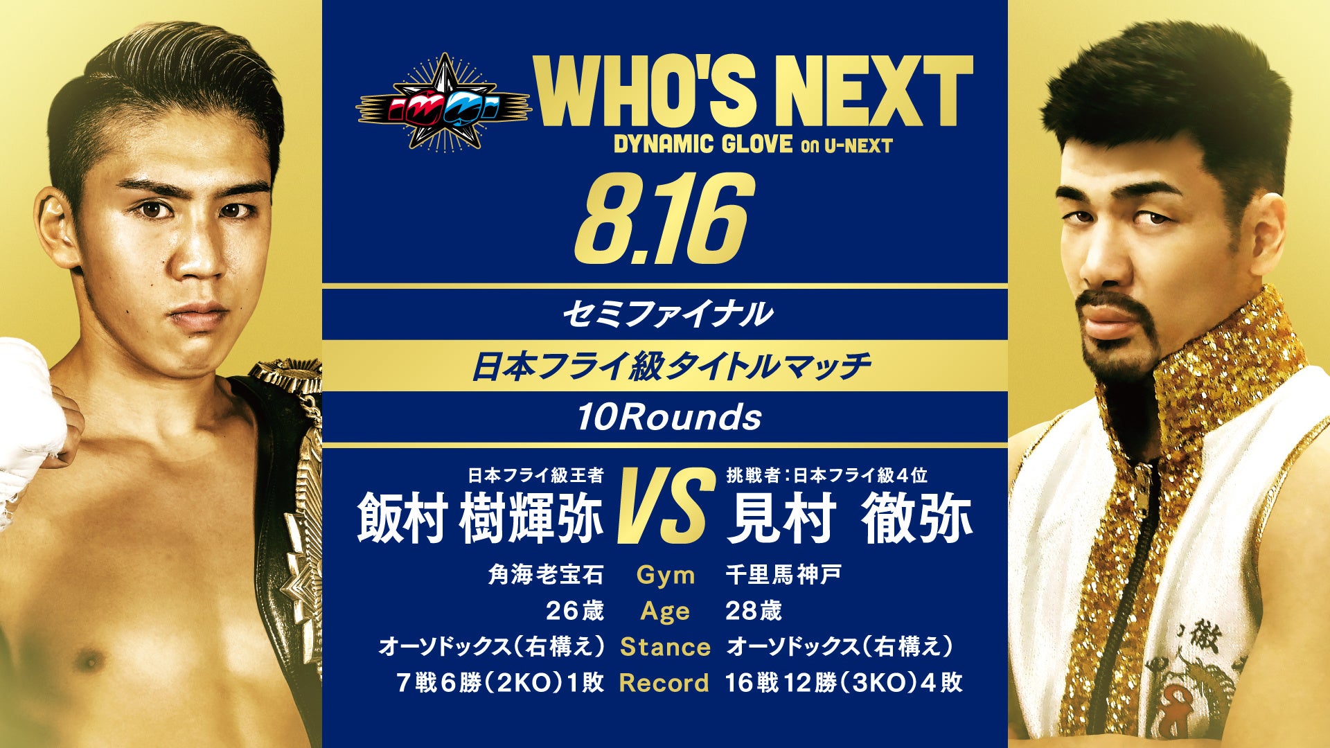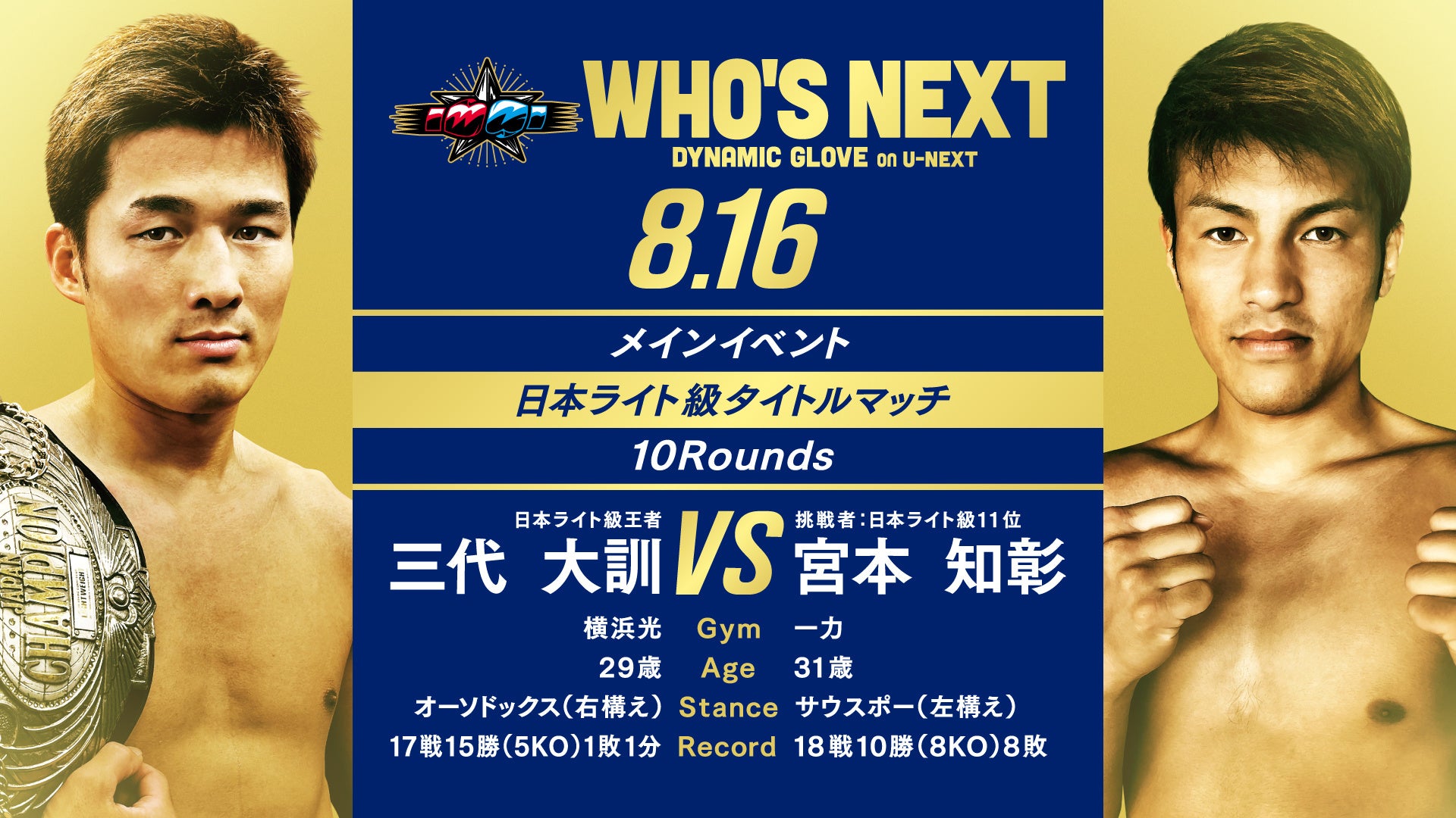 8月16日(土)後楽園ホールにて開催される「WHO‘S NEXT DYNAMIC GLOVE on U-NEXT Vol.21」を、U-NEXTにて独占ライブ配信いたします。