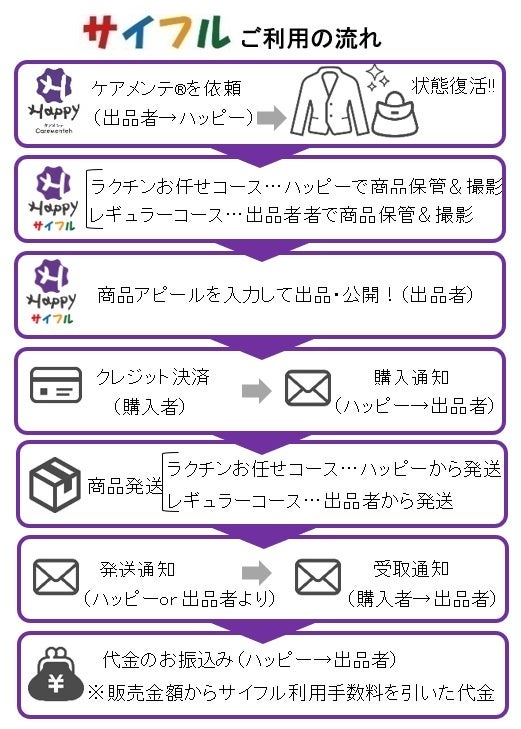 中古品の売買における不満やトラブルを解消し、“売り手”は 高値で売れ、“買い手”は新品を買うよりずっと安値で買えるという、売る人も買う人もHappyになる世界初のフリマアプリの『Happyサイフル®』です。中古品販売における不満市場を満足市場に変えて廃棄される運命の服飾品を減らし、お客様満足と地球環境保全(カーボンニュートラル)に貢献してまいります。