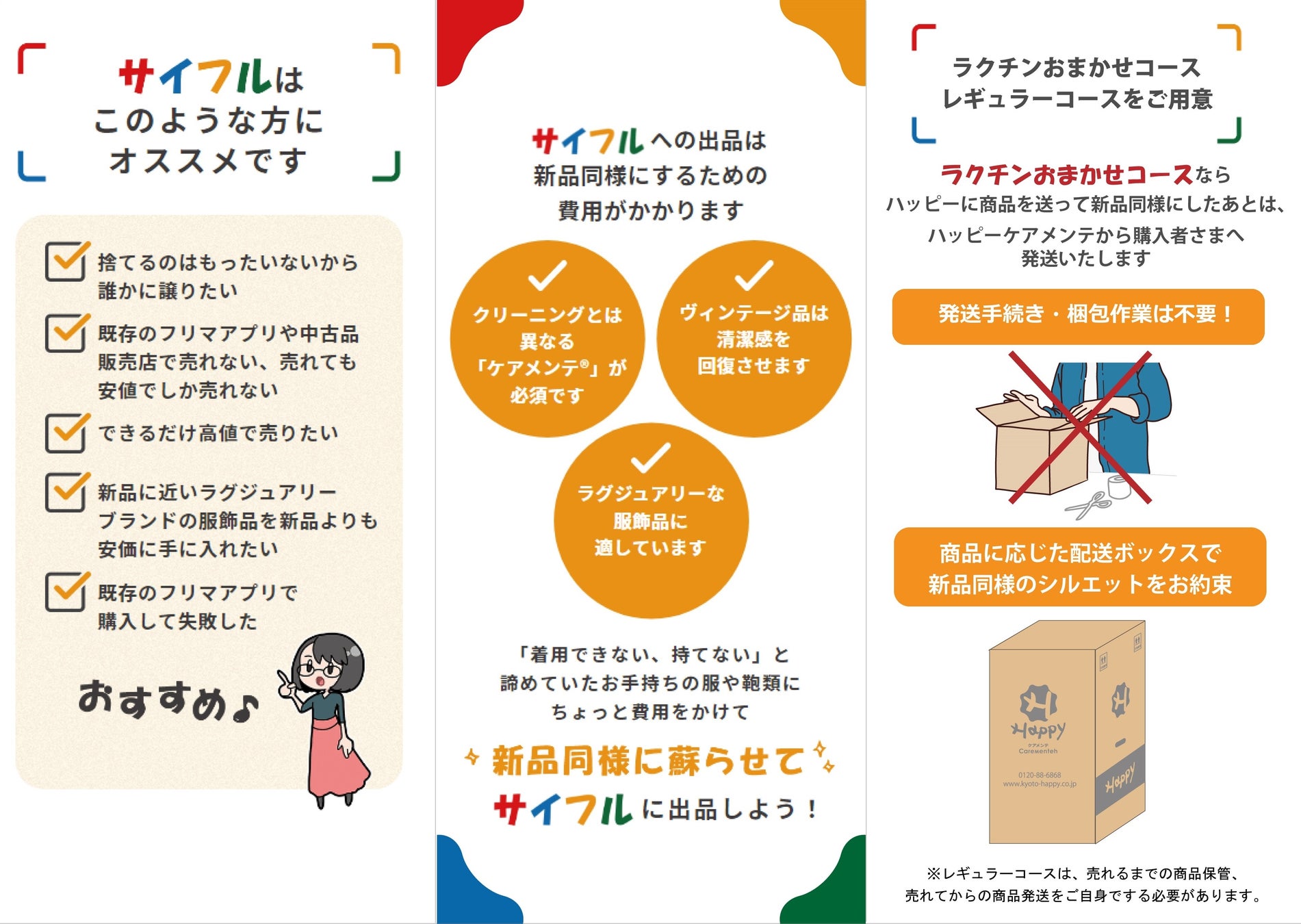 『サイフル®』とは、再生ユースフルの略称造語であり、当社「ハッピー」が責任を持って、新品同様に蘇らせた服飾品の限定商品を個人間で売買できる“場”を提供します。