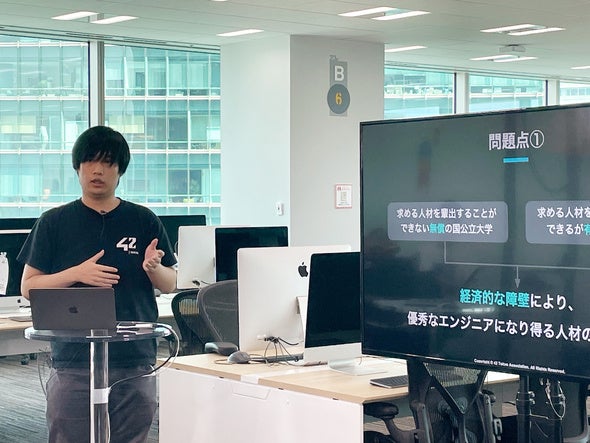 フランス発のエンジニア養成機関42 Tokyoは、年齢、学歴、性別に関係なく、学費が無料で誰でも平等に教育を受けられる機会を提供。また、授業は教師から学生への一方通行ではなく、学生同士が学びあう「ピアラーニング」方式を採用しています。