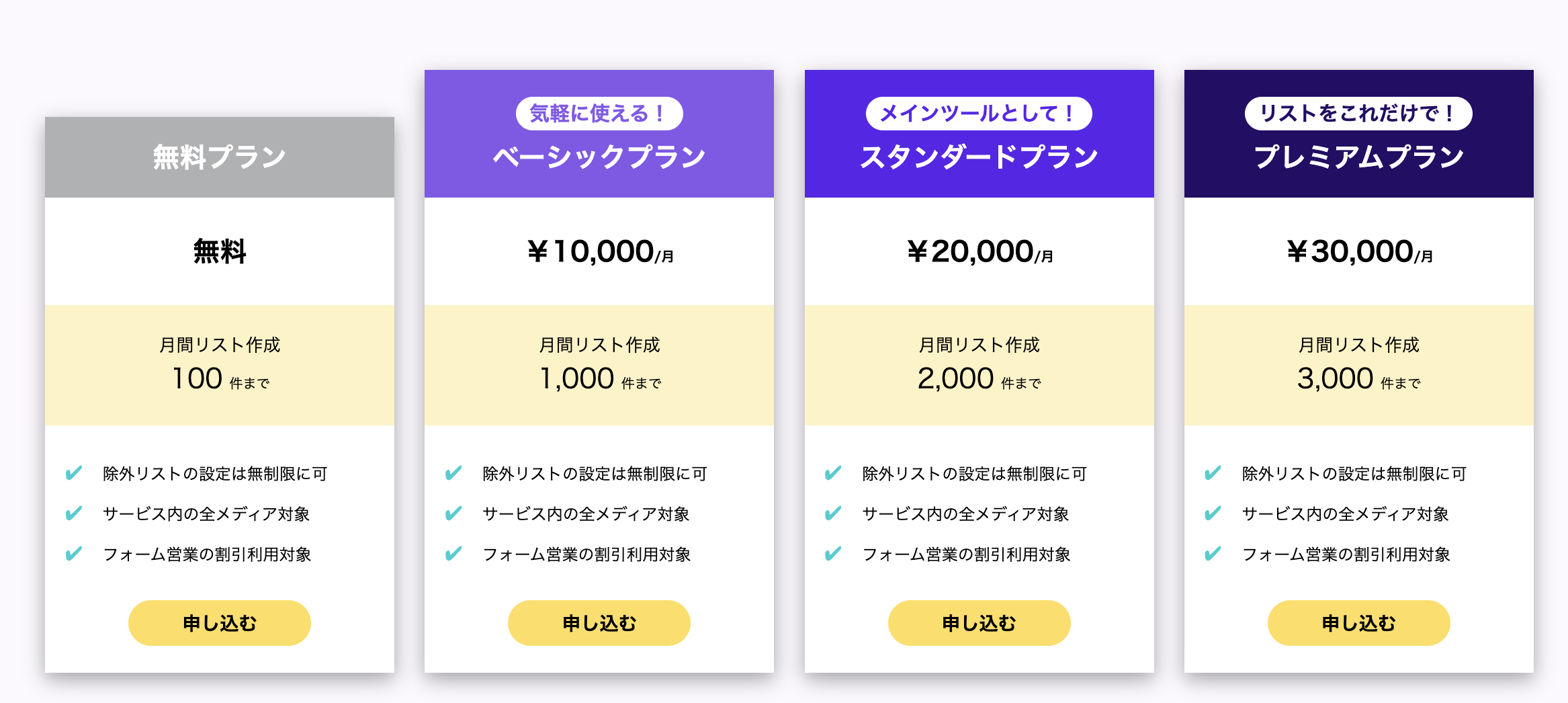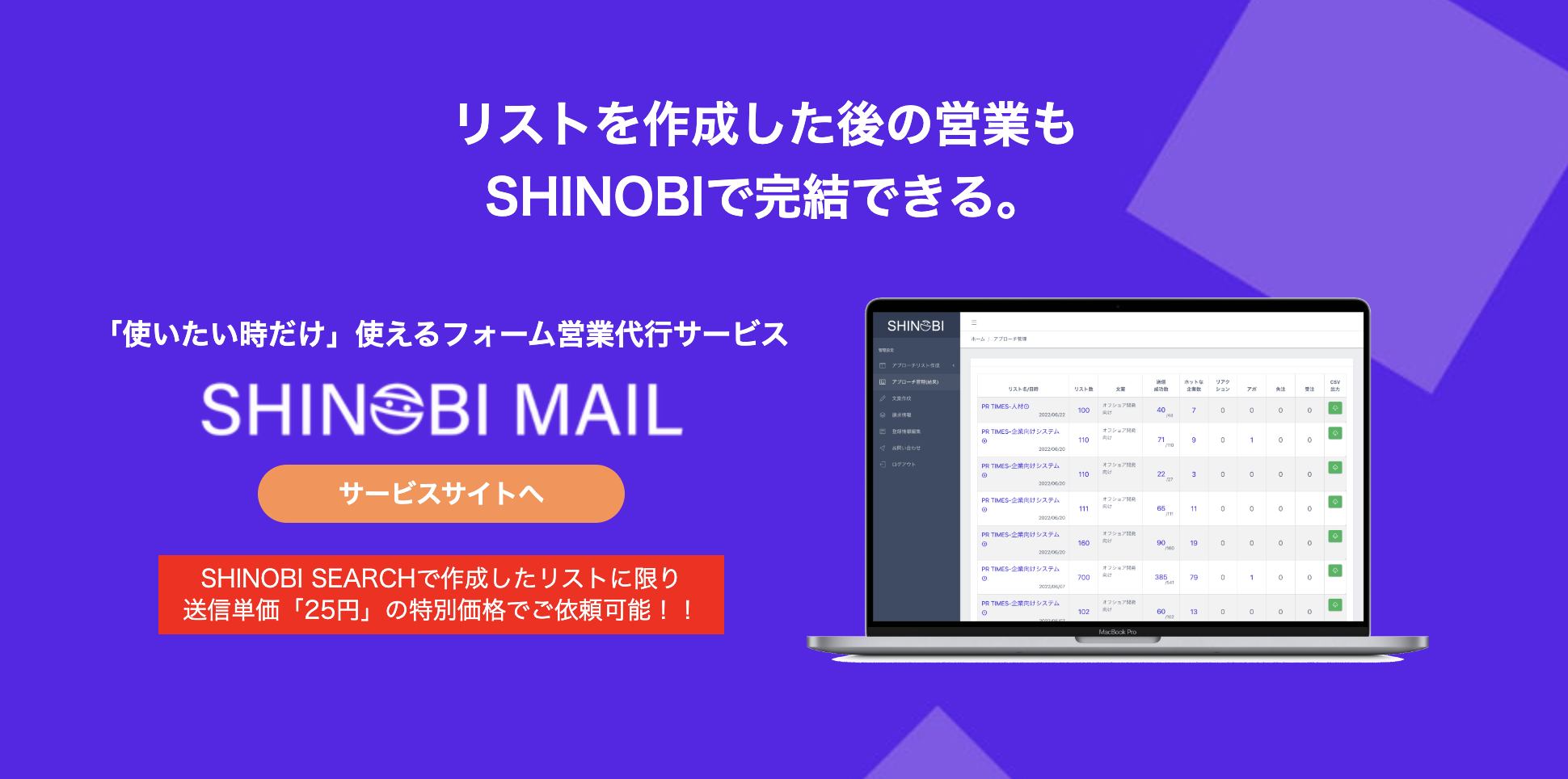 完全従量課金型問い合わせフォーム営業代行サービス(http://lp.shinobimail.com/)を併用していただくことにより、リスト作成だけでなくリード獲得までワンストップで可能になります。