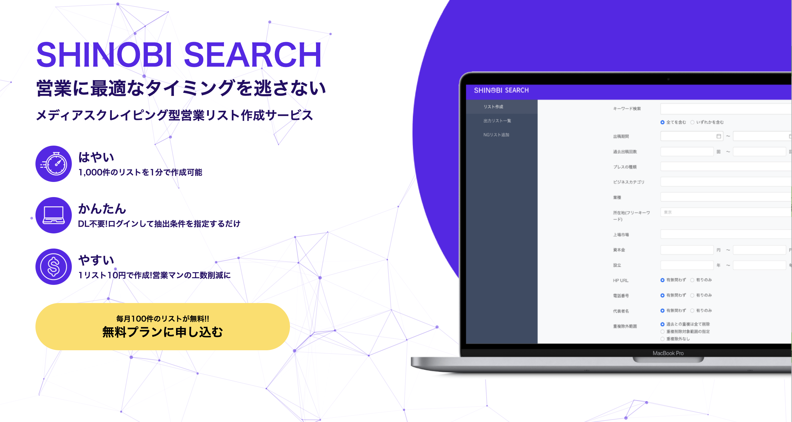 取得したいメディアを指定して営業リストを作成できるツール「SHINOBI SEARCH」β版を提供開始。