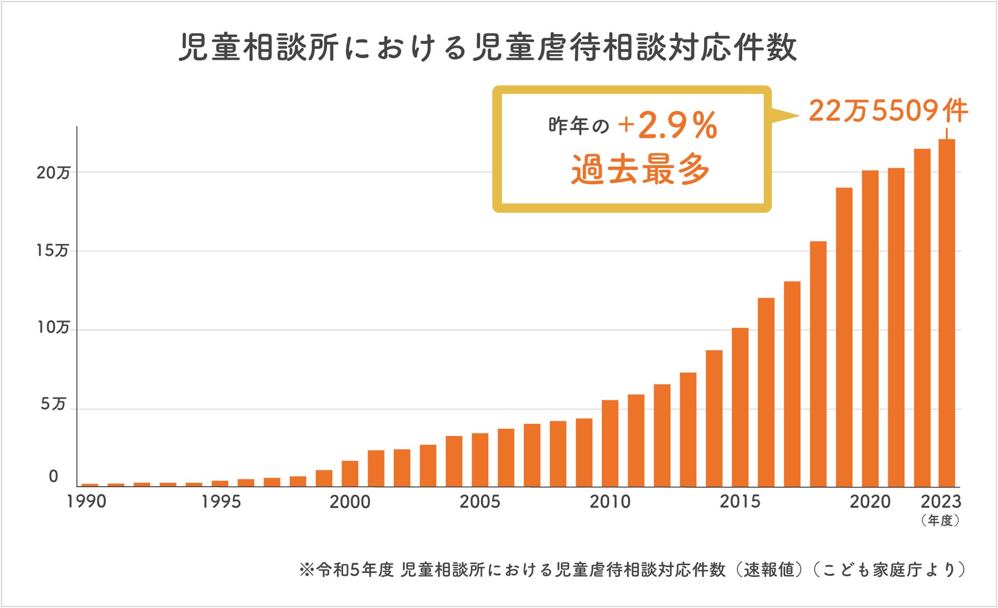 年々増え続ける児童虐待、年間の児童虐待対応件数は約22万5,000件。