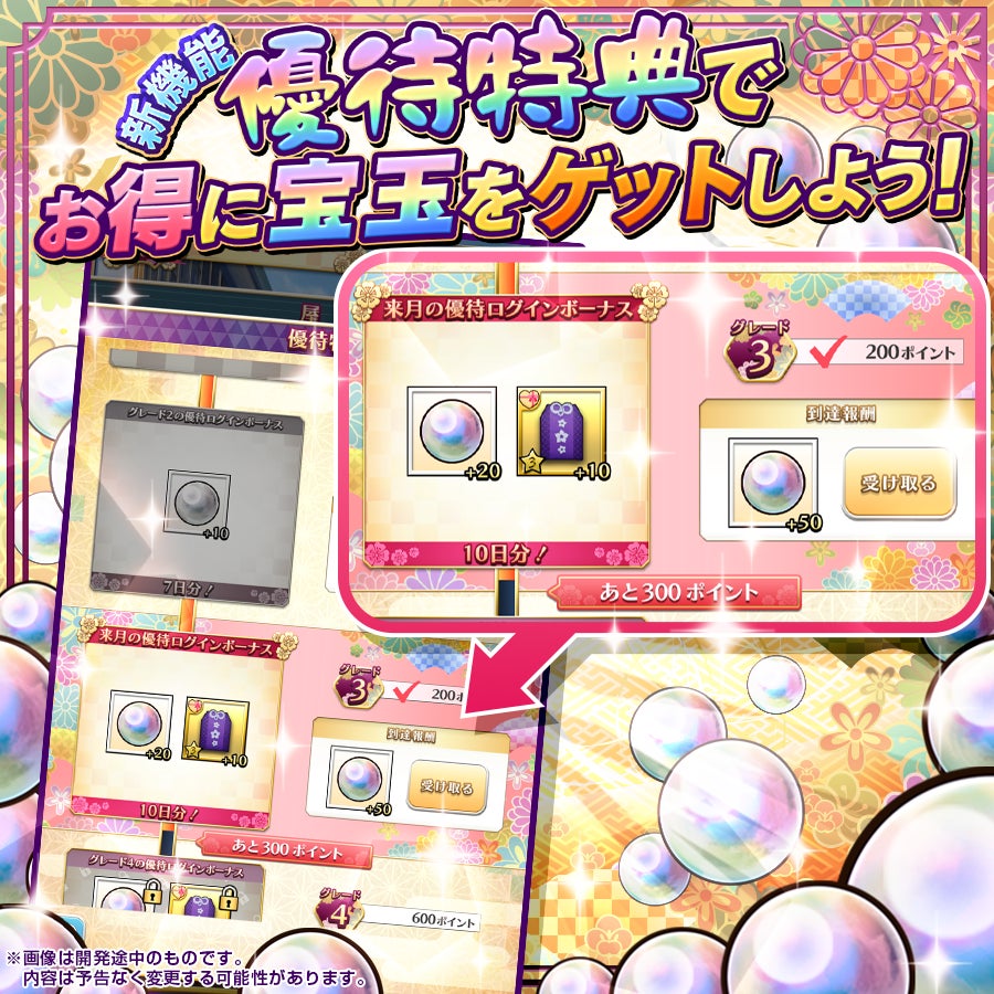 月の課金額に応じて報酬を獲得でき、さらに、翌月には優待特典として、宝玉が受け取れる特別なログインボーナスがスタートします。よりお得に宝玉をゲットするチャンスです!