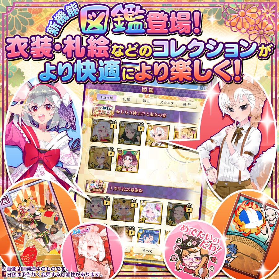 これまでに登場した衣装・札絵・称号・演出が一覧できる図鑑機能が登場予定です。
