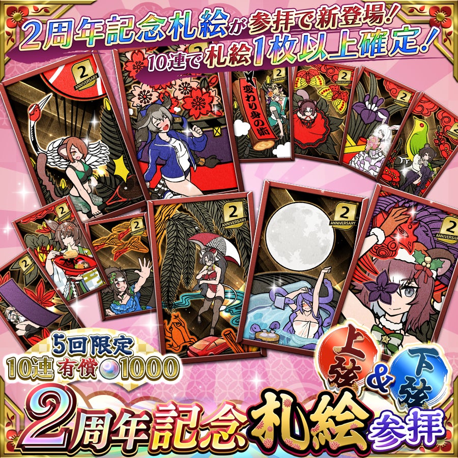 この1年間に登場した衣装をもとに描き下ろした、全48枚の2周年記念札絵が参拝で登場します。