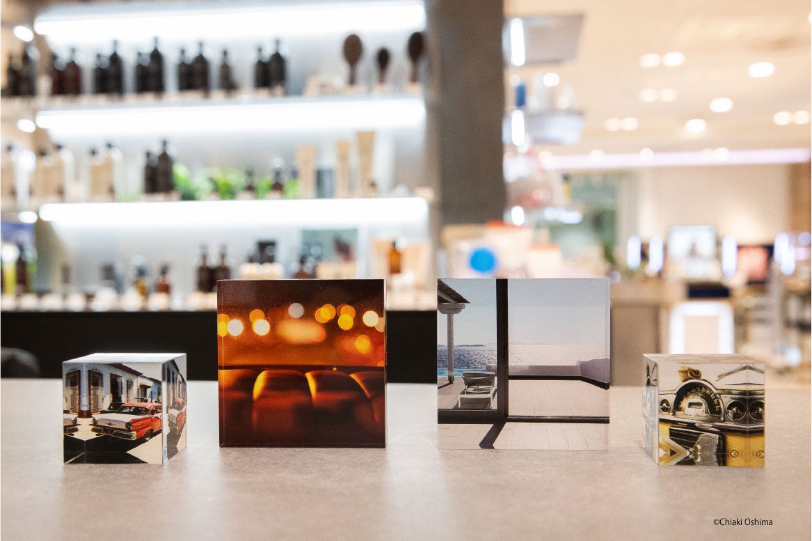 店内には大島央照氏が旅して撮影をした風景のアクリル作品を展示!